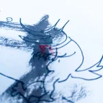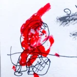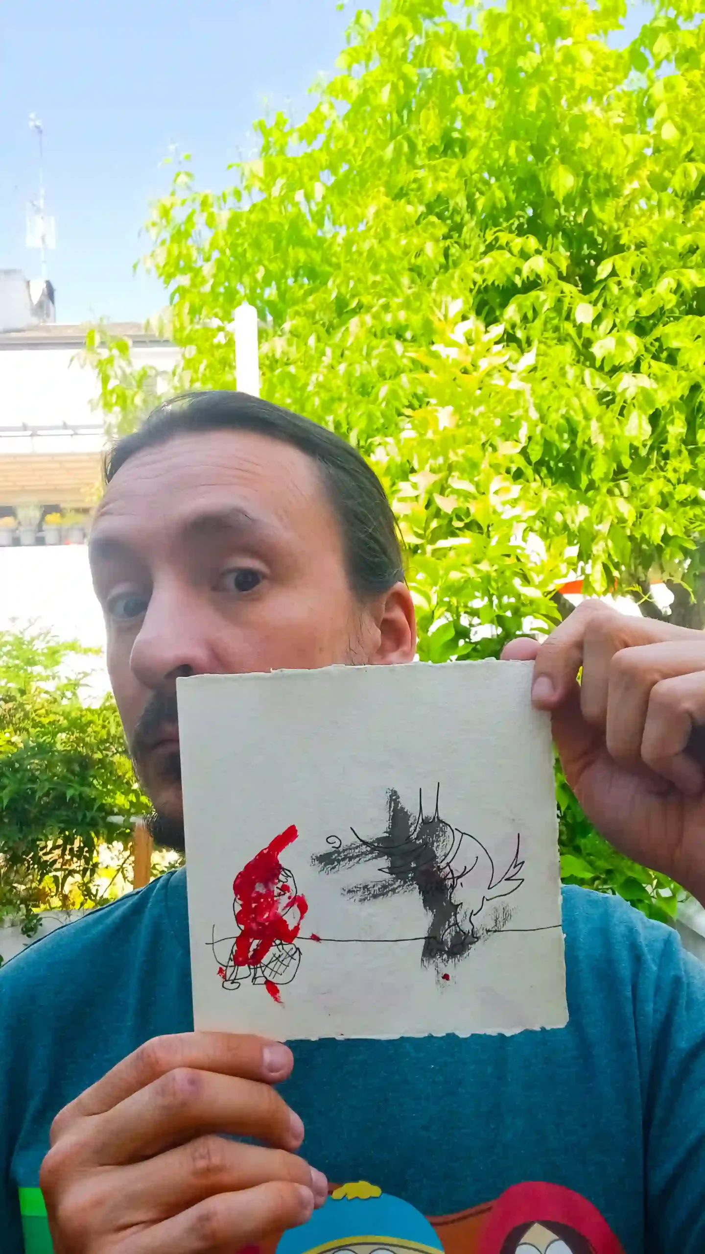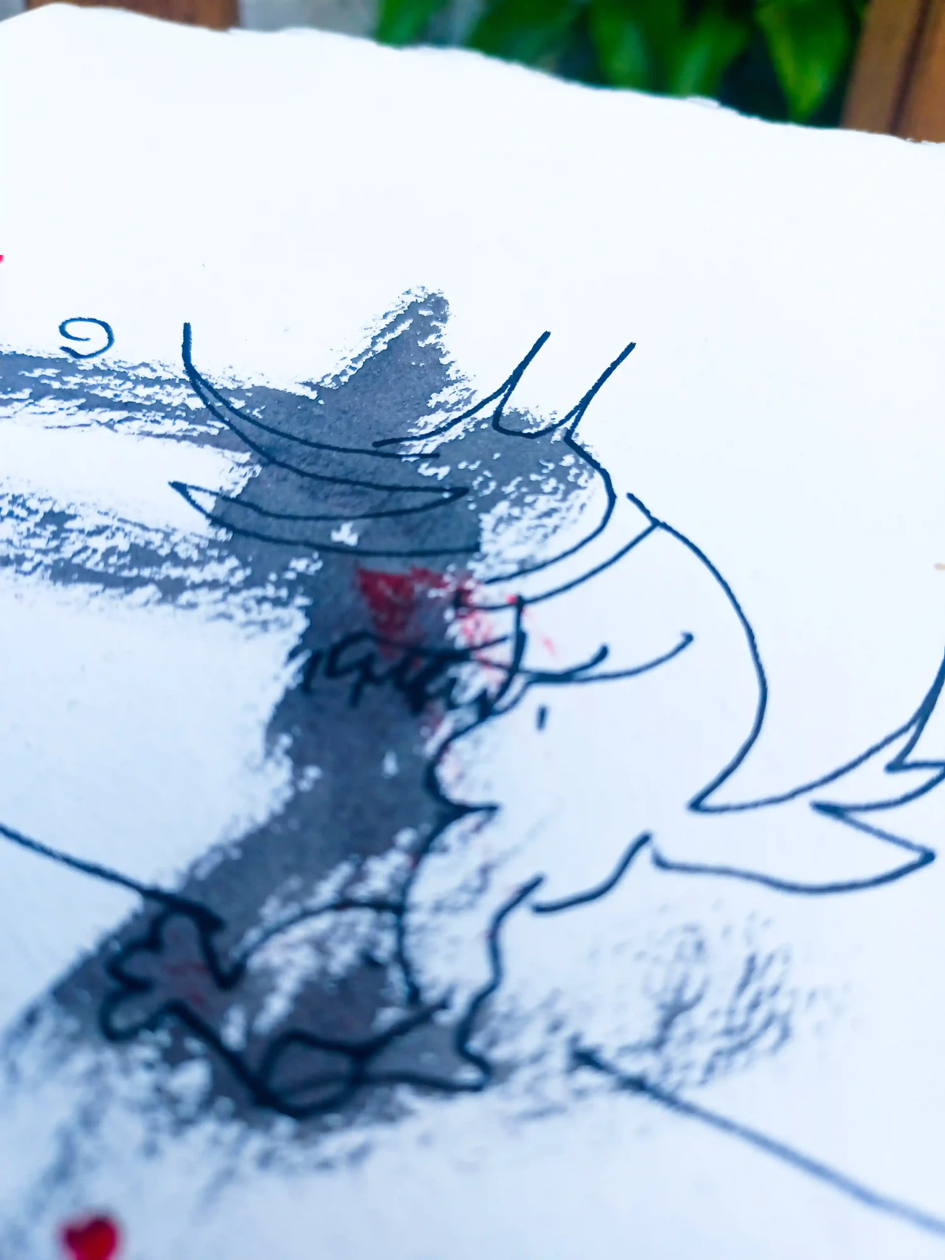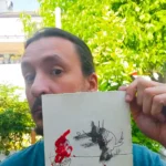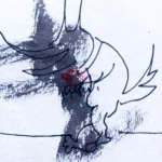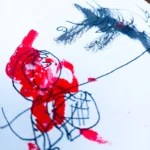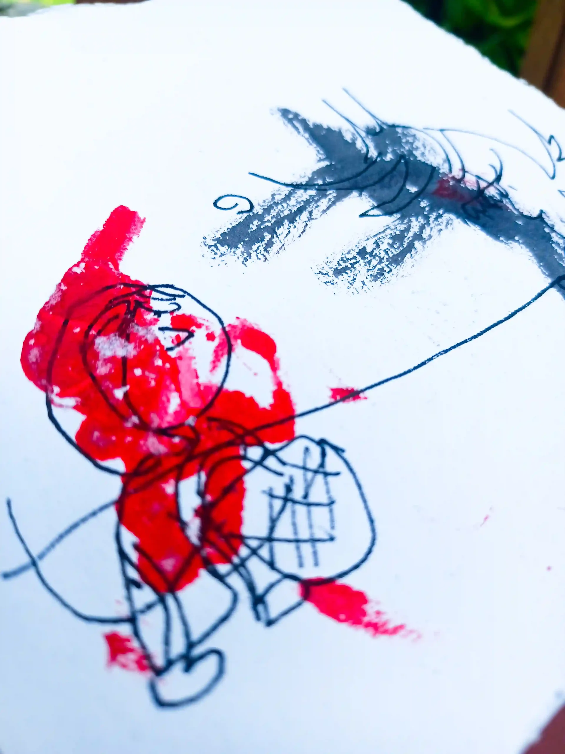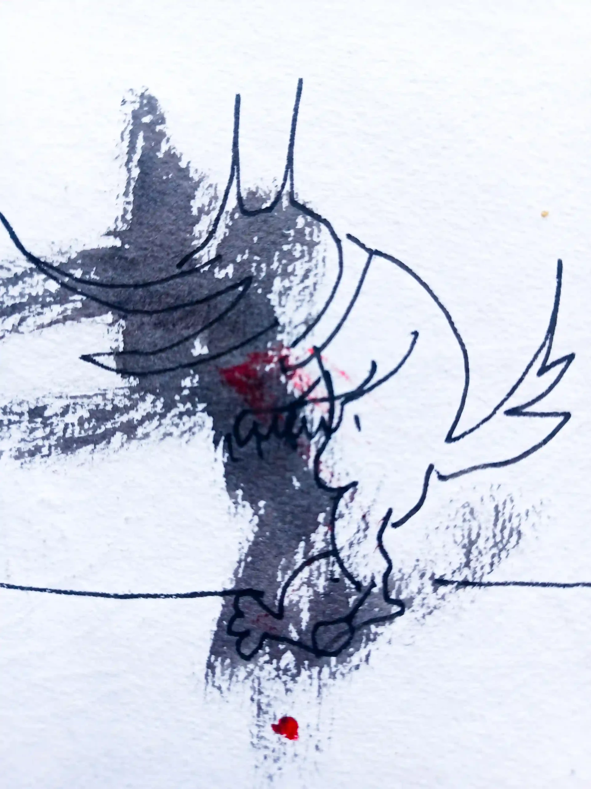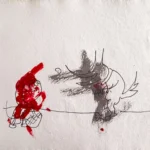 El lobo, claro, no podía faltar. Aquí simboliza a los hombres que se aprovechan de su necesidad, de su cuerpo, sin ver su alma. La escena está dibujada con trazo figurativo —algo poco común en Vilipendios— y luego intervenida con acrílico rojo y aguada de tinta china aplicada con la técnica de la decalcomanía, popularizada por el pintor canario Óscar Domínguez. Esta técnica consiste en crear texturas a partir de la presión entre superficies húmedas, revelando formas inesperadas. Es un método de hallazgo, igual que este dibujo, igual que este momento.