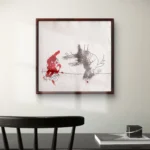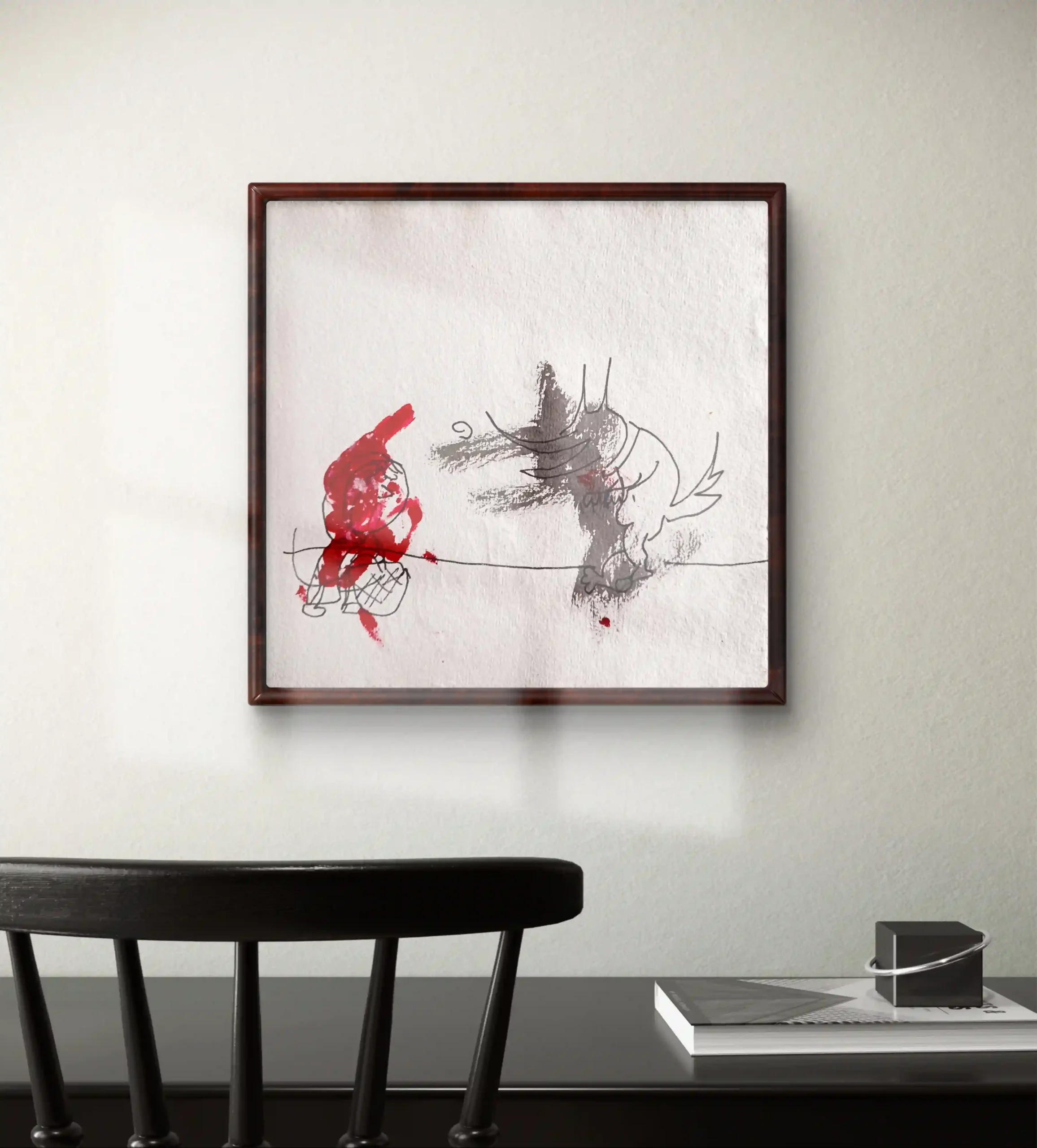 Recuerdo perfectamente cómo surgió Caperucita: estaba en clase, en la academia de arte. El profesor leía un fragmento de una novela clásica que nada tenía que ver con cuentos infantiles. Pero algo en ese texto, en ese momento, me llevó a dibujar esta escena. Como si algo se activara sin pedir permiso. Y simplemente me dejé llevar. Así funcionan estas piezas: son dibujos subconscientes, visiones que llegan antes de que uno sepa por qué.