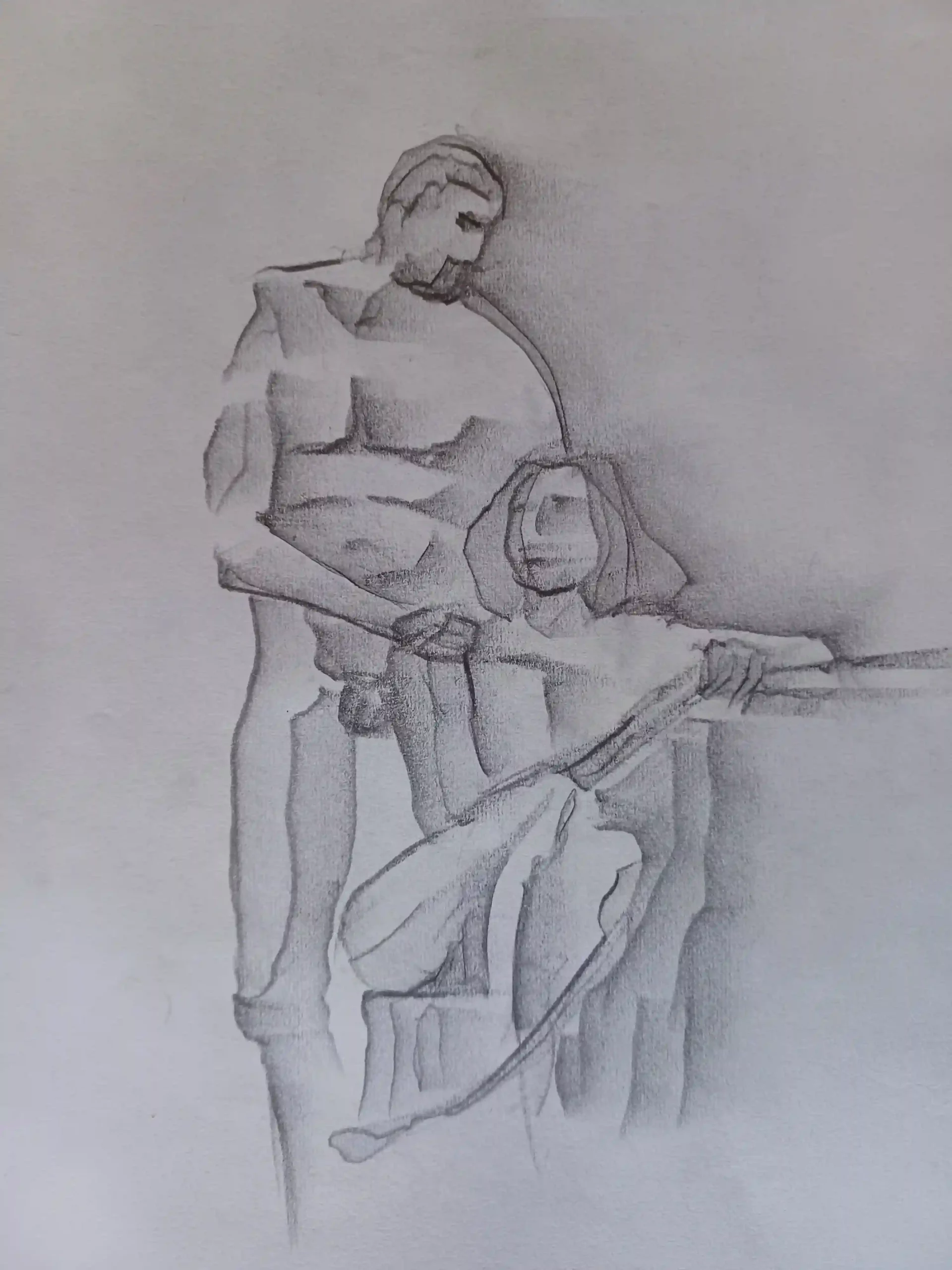 Siempre he creído que en lo simple se esconde la mayor belleza. Este dibujo figurativo es un claro ejemplo de eso. A través de una técnica minimalista, he buscado captar la esencia de la figura humana y las emociones que los personajes transmiten. El lazo emocional entre ellos, aunque sutil, está ahí, esperando ser descubierto por quien observe la obra. Cada trazo tiene un propósito, y la sencillez de la escena invita a apreciar lo que muchas veces pasa desapercibido en la vida cotidiana.