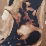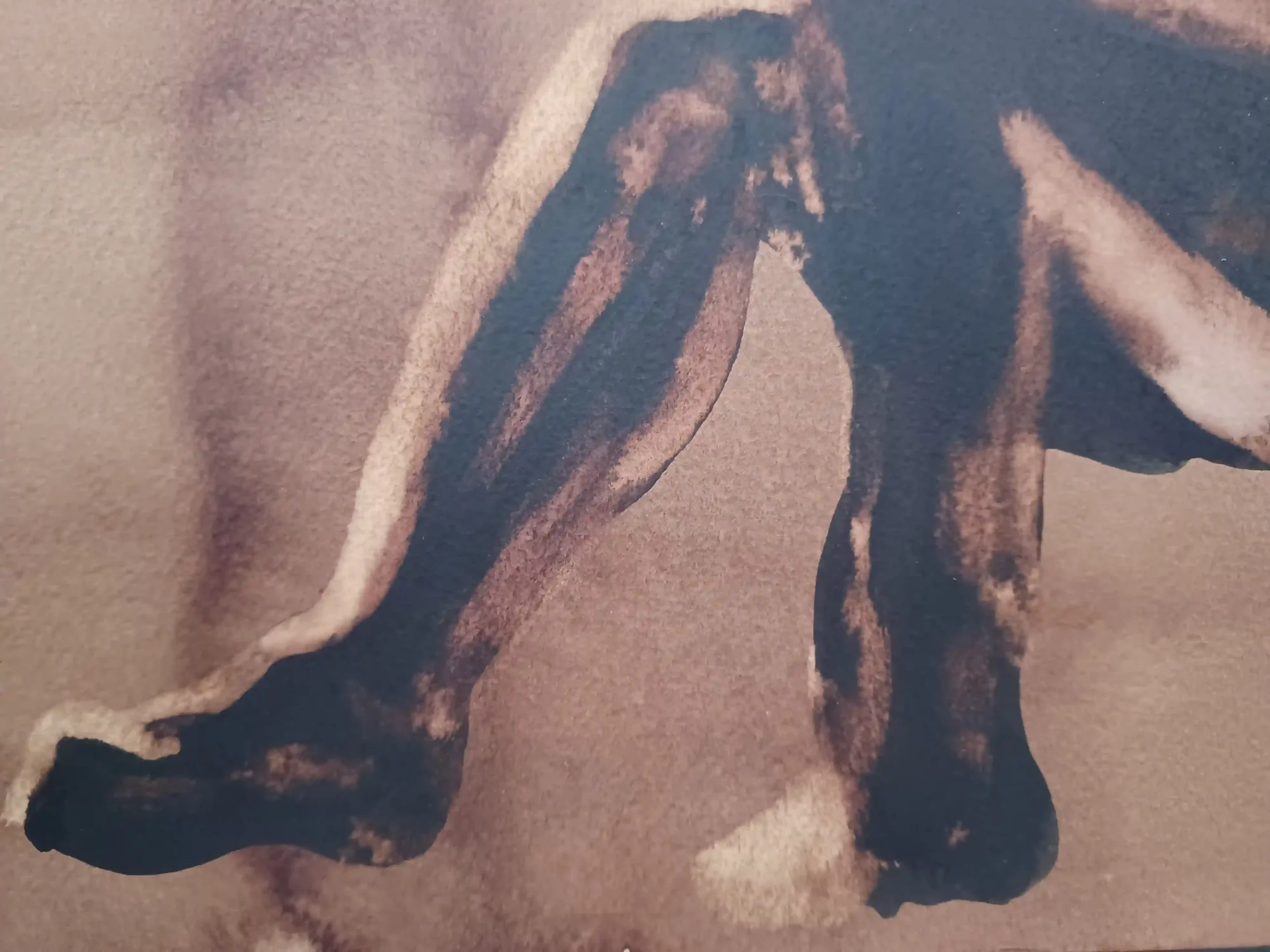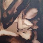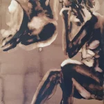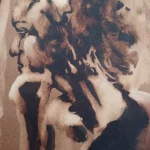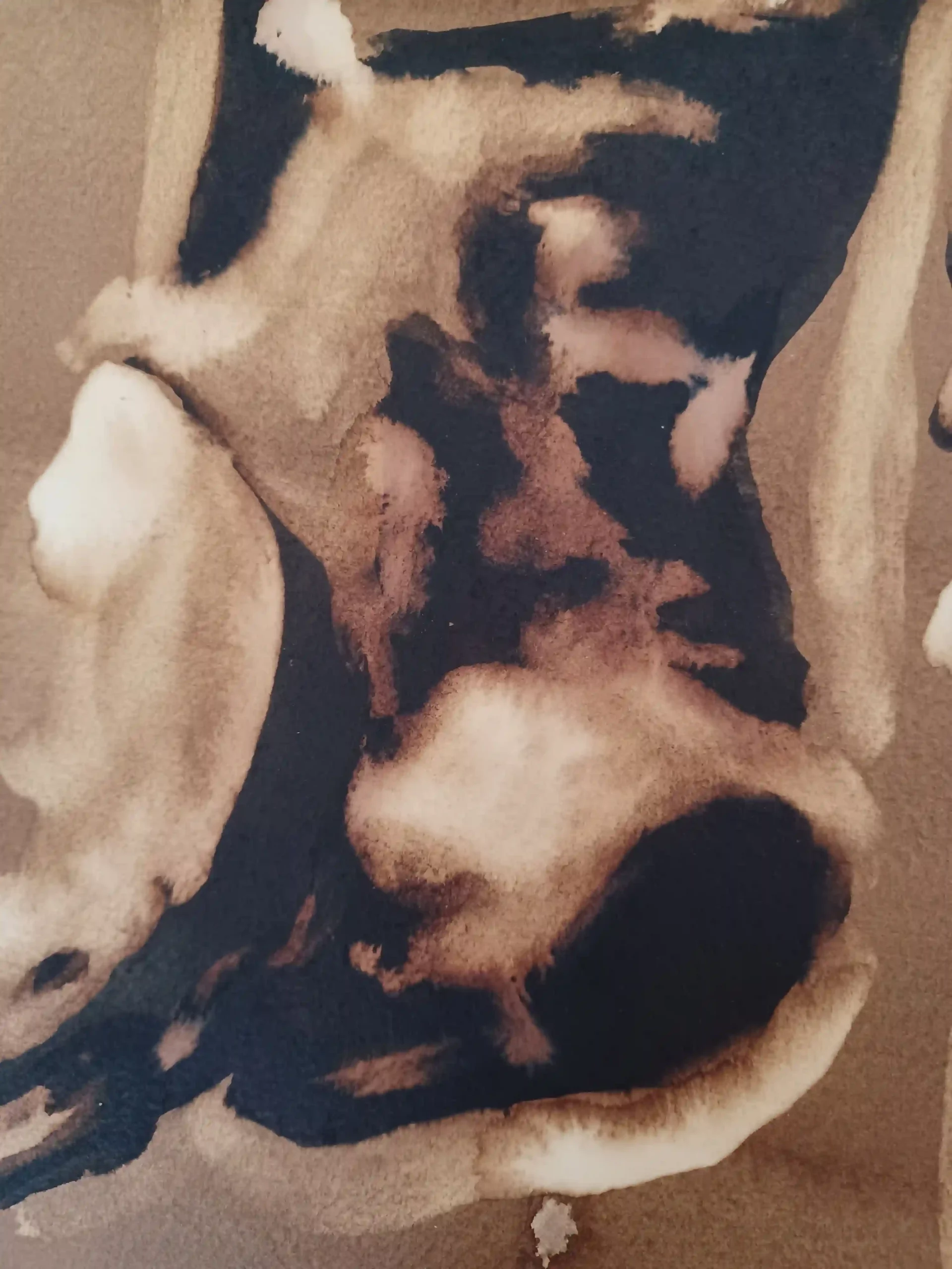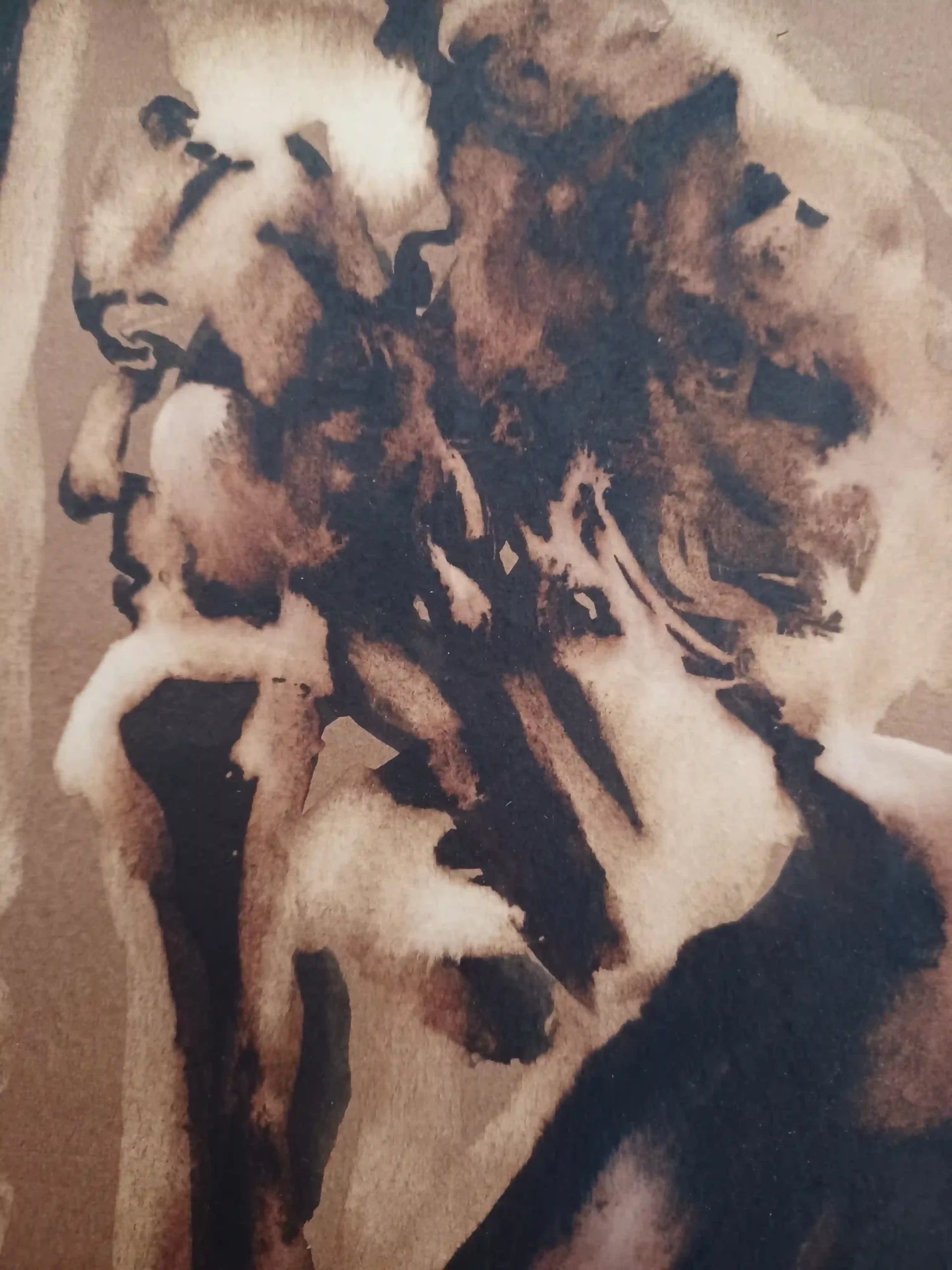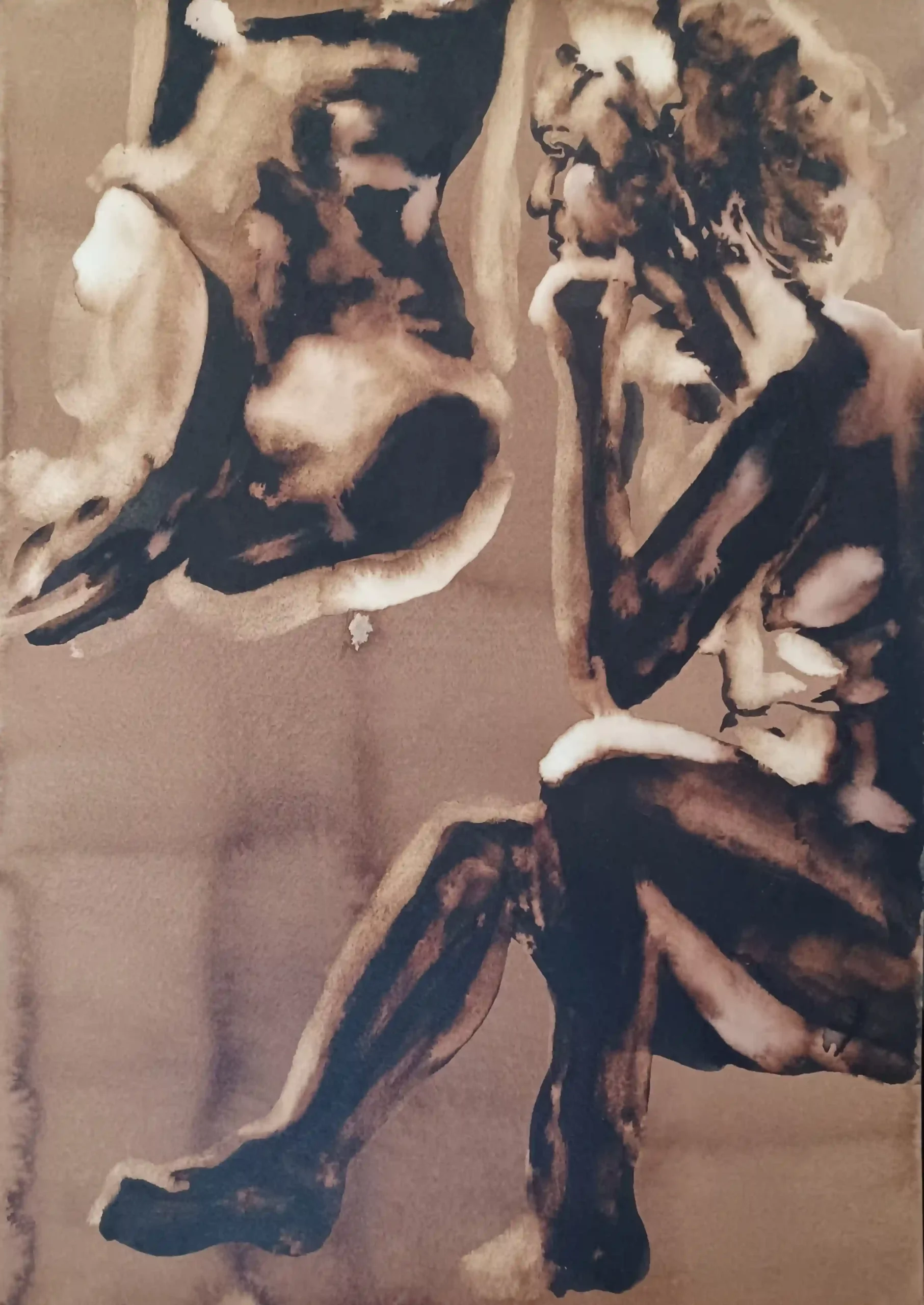 Cuando observas esta obra, lo primero que me llama la atención es el contraste entre la suavidad de las sombras y la fuerza de las figuras. He utilizado nogalina y tinta china para crear un efecto que atrapa la atención, pero esta obra tiene algo distinto. El tiempo de posado de la modelo fue mayor, lo que me permitió profundizar en los detalles de luces y sombras, algo que en mis obras anteriores no había explorado tanto.