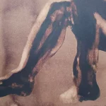 La nogalina interactúa con el papel de una manera única, cuando aplico lejía para resaltar los puntos de luz más importantes para mí. Esta vez, quise llevar la técnica un paso más allá, aplicando gradaciones tonales tanto en las sombras como en las luces. El resultado es un equilibrio entre áreas oscuras e iluminadas. Me llama la atención especialmente la figura de la derecha, la definición del abdomen y el pecho después de la degradación de la nogalina con lejía.