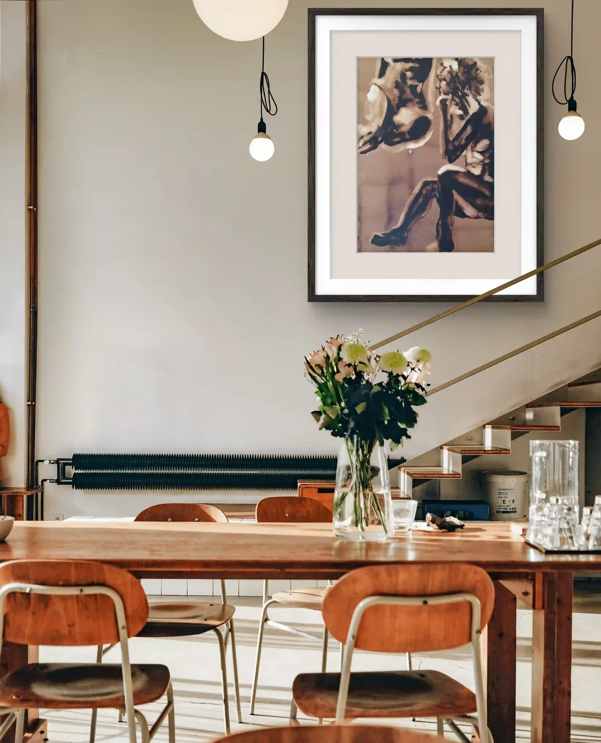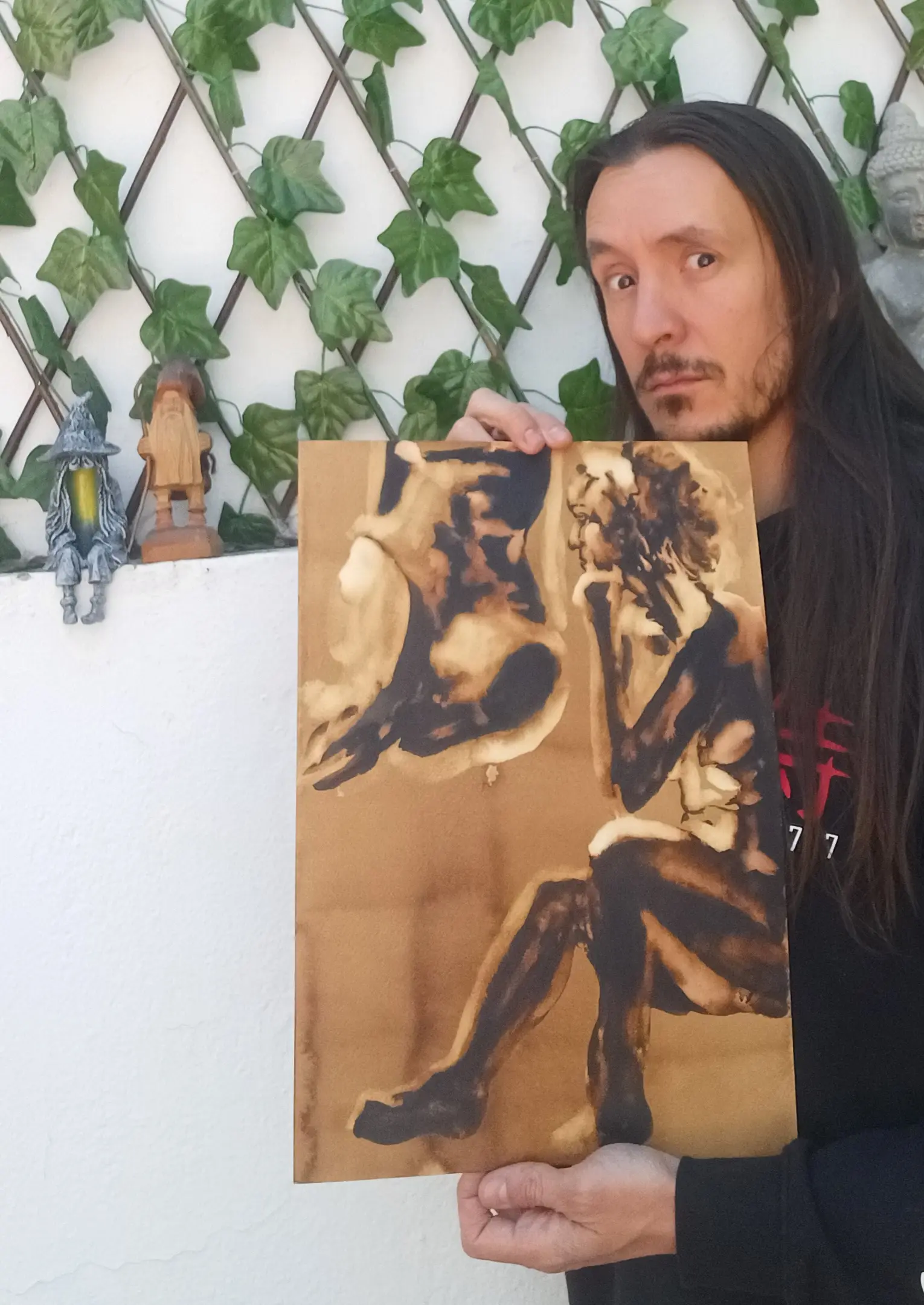 Si eres un coleccionista que aprecia el arte que equilibra tradición y experimentación, esta obra habla directamente de esa conexión. No es solo una representación de cuerpos, sino una exploración de texturas, gradaciones y técnicas que aportan una profundidad única a la pintura. Cada trazo con nogalina y tinta china está pensado para capturar la esencia del modelo y, al mismo tiempo, dejar espacio para lo inesperado.