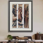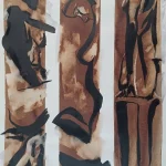 Esta pieza es una representación de la sensualidad femenina en su forma más pura y simple. En este tríptico (pack de tres ilustraciones), cada una de ellas está dividida en franjas verticales para resaltar diferentes posturas de la misma modelo, algo que he repetido en varias de mis obras. Lo que busco es capturar la esencia del cuerpo femenino con un enfoque escultórico. He trabajado en esta obra con trazos rápidos y precisos utilizando tonos sepia y tinta china, lo que le otorga ese contraste tan drástico y elegante.