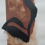 El cuerpo de la modelo en la franja derecha es un claro ejemplo de cómo las sombras y las luces juegan un papel crucial en la definición de la figura. La manera en que las sombras se deslizan por su espalda acentúa esa forma femenina que transmite sensualidad, especialmente en la curva de la cadera. Si te fijas en los destellos de luz hechos con lejía, puedes notar cómo el pecho se insinúa suavemente desde un perfil casi escondido. Este tipo de detalle es algo que siempre busco en mis obras: una combinación de sutileza y fuerza.