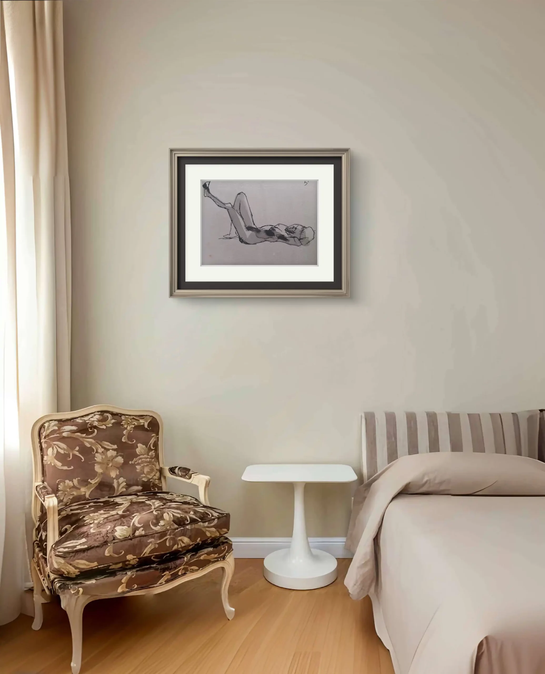 Trabajar en aguada sobre papel fue una elección deliberada para capturar la rapidez y autenticidad del trazo, algo que siempre me ha fascinado por su capacidad de reflejar la esencia sin distracciones. Con la aguada y el pincel, «Cuerpo en Esencia» representa el movimiento en proceso, ese instante que se desliza entre las poses de la modelo y que exige que la mano se mueva con la misma certeza y velocidad. Este estilo me permite unir la tradición de los estudios de desnudos con una perspectiva contemporánea, donde lo imperfecto y lo abrupto son valores estéticos en sí mismos. Cada línea y sombra reflejan no solo el cuerpo de la modelo, sino también el desafío que supone capturar la realidad en su forma más pura y honesta. Es una pieza pensada para aquellos coleccionistas que aprecian el arte sin concesiones.