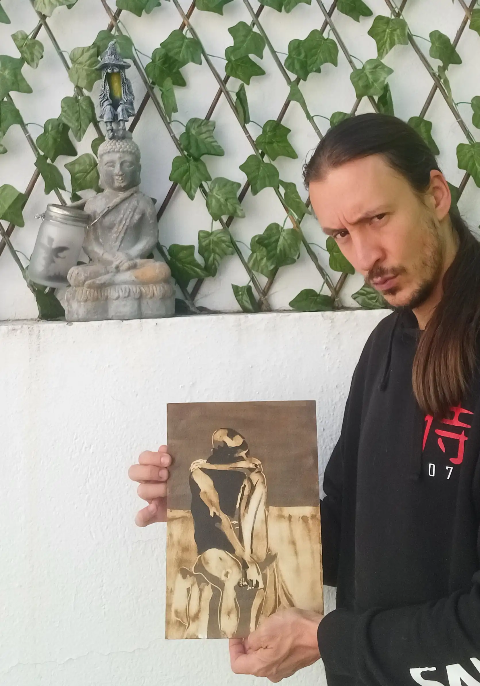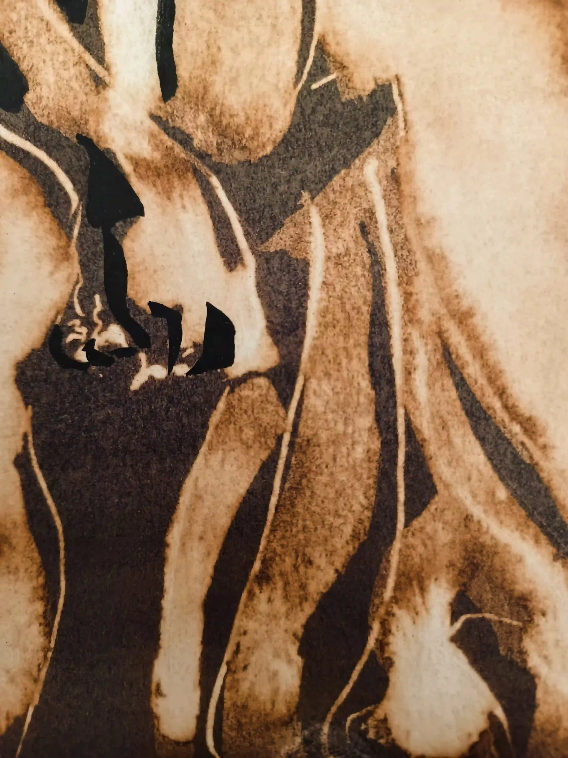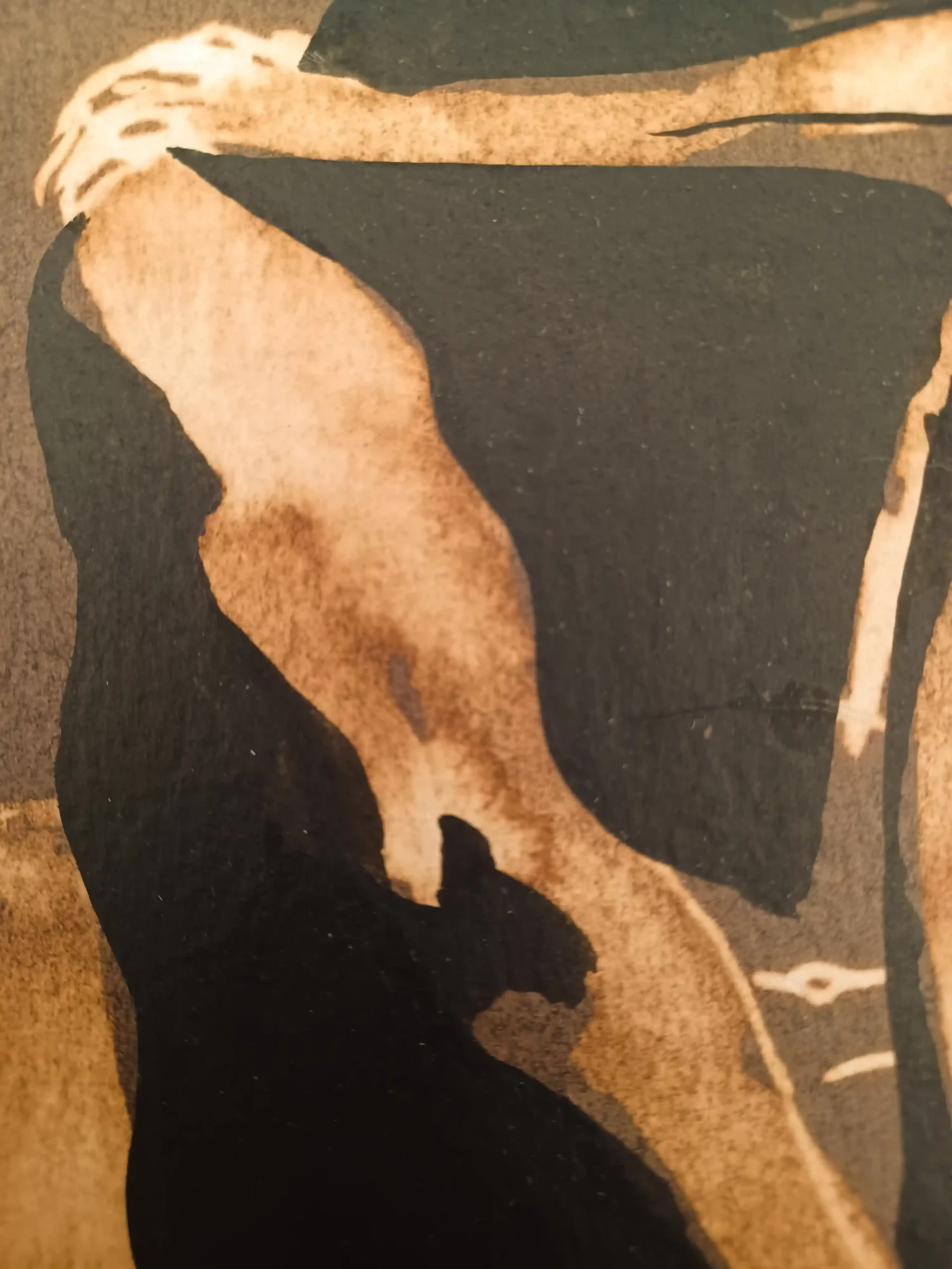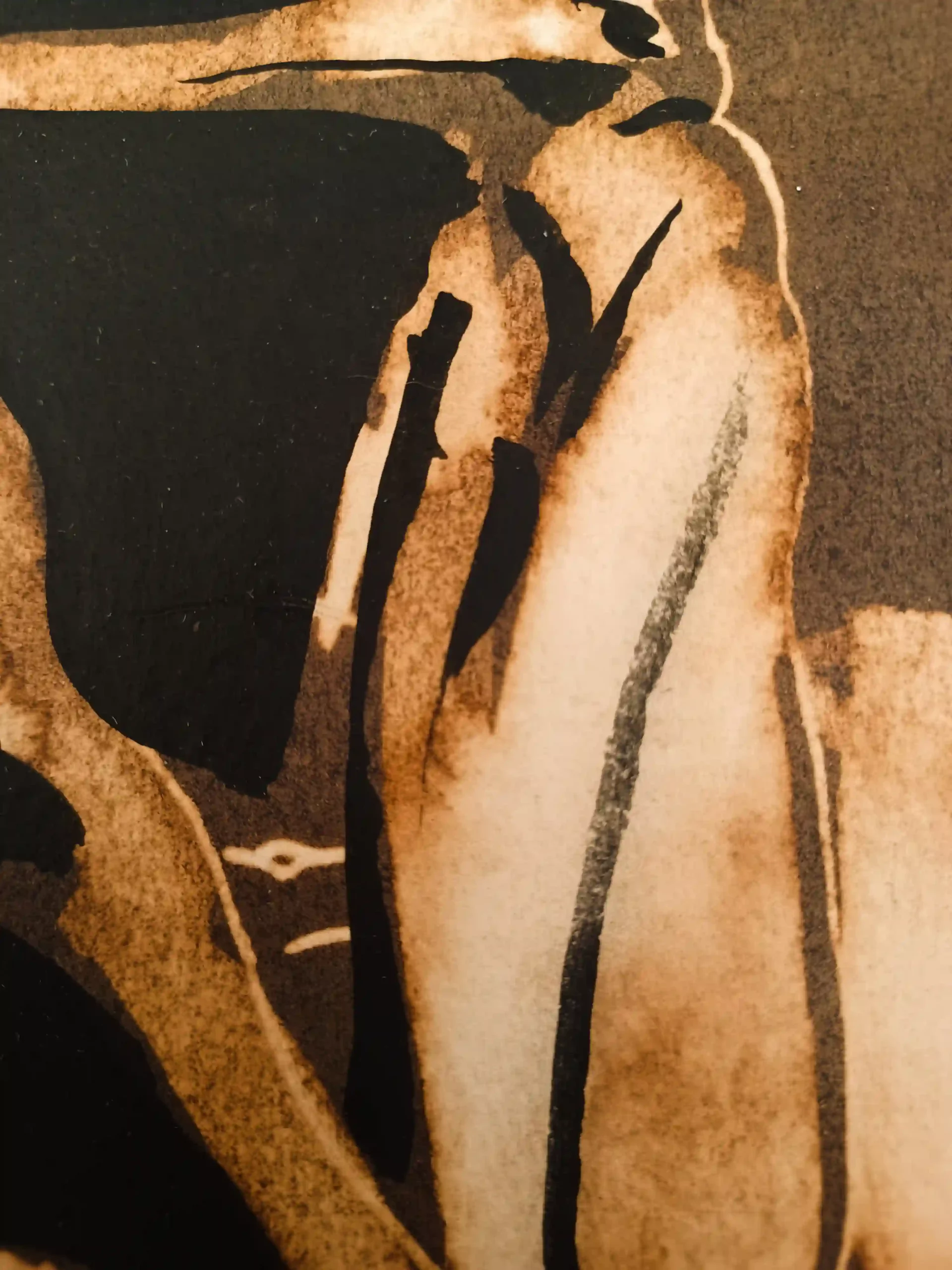 Esta obra, titulada simplemente como un desnudo artístico en sepia, es el resultado de una exploración profunda del cuerpo humano, empleando técnicas mixtas que aportan tanto realismo como simbolismo. Para su creación, trabajé con nogalina, lejía y tinta china, aprovechando las propiedades únicas de cada uno de estos materiales. El uso de la tinta china me permitió lograr esos planos de sombra tan cortantes y duros, creando contrastes visuales que parecen casi escultóricos, mientras que la nogalina suaviza esas transiciones con gradaciones que se sienten más orgánicas y naturales.