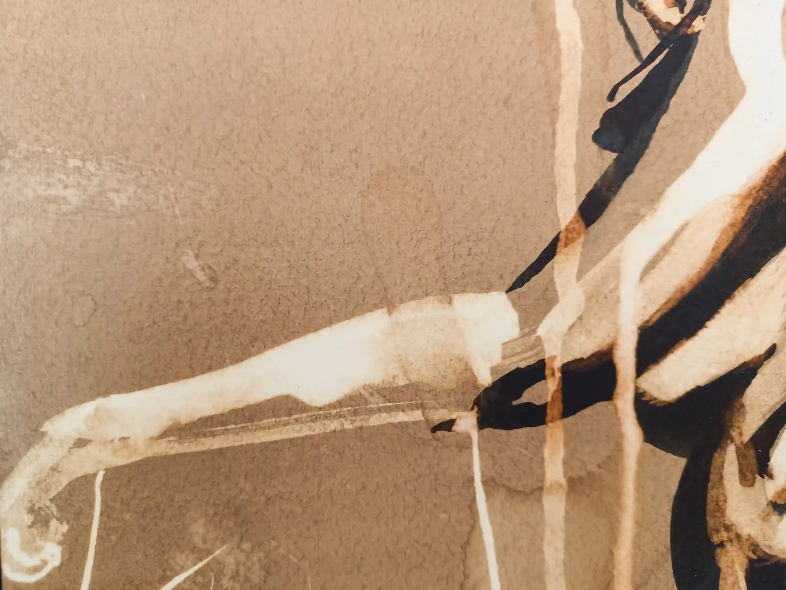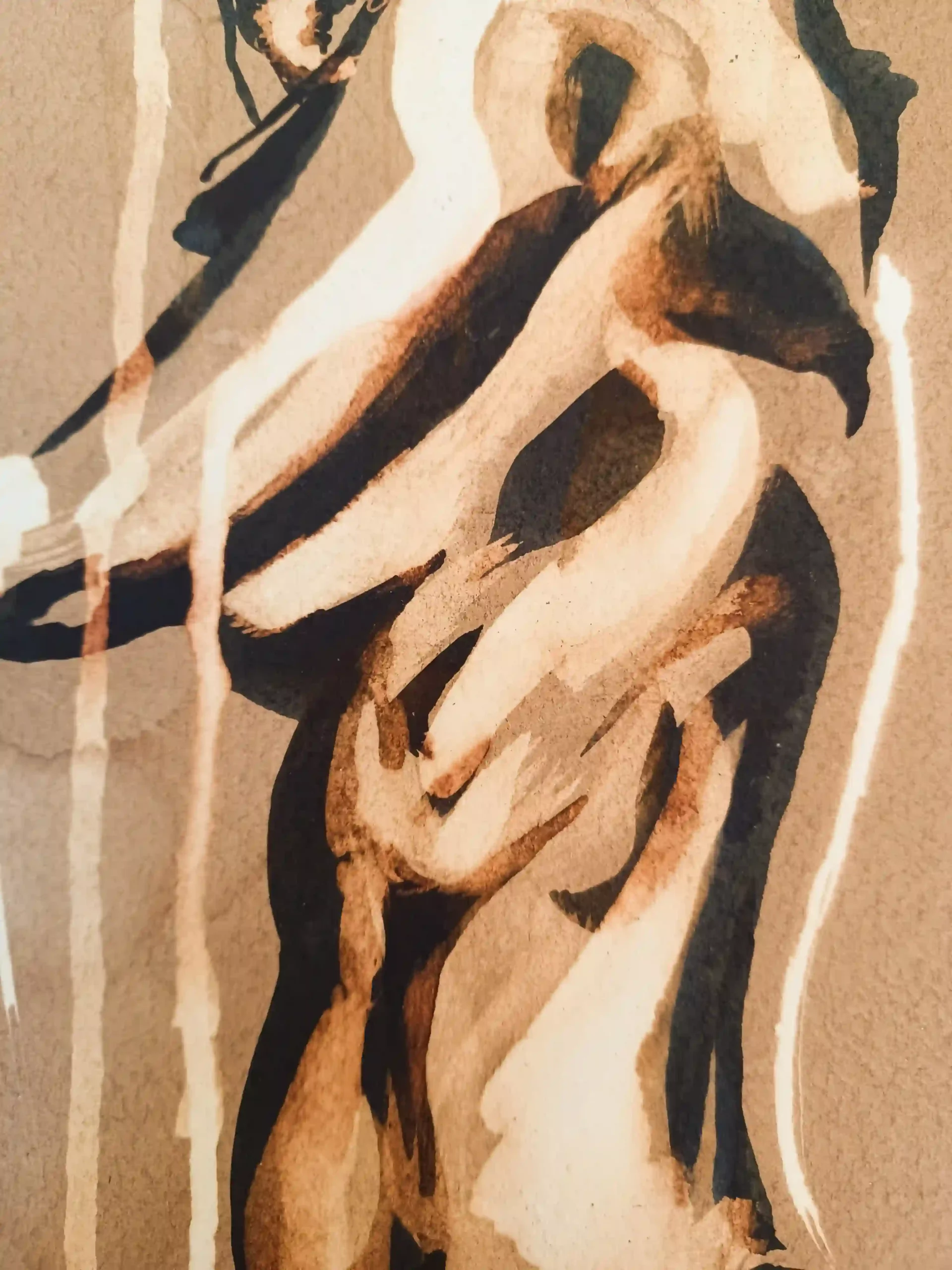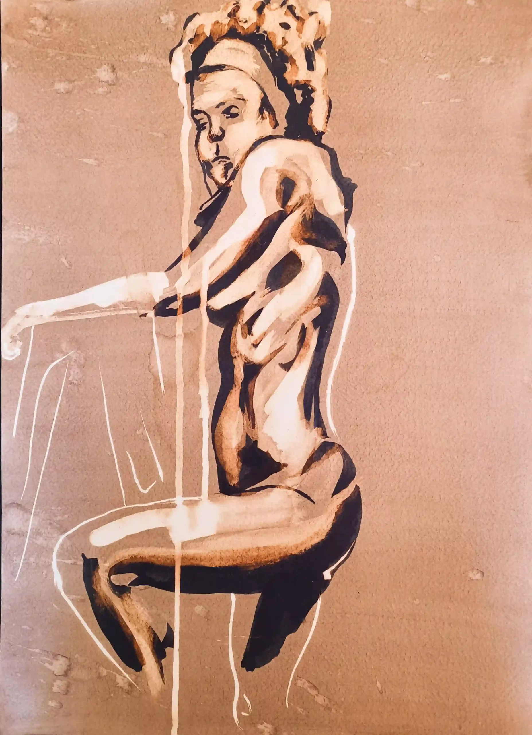 Este dibujo en particular surgió de una de esas sesiones impredecibles. Había preparado un folio con nogalina, un material que me encanta por la textura que aporta al dibujo, y decidí comenzar directamente con la lejía y la plumilla. La modelo, con sus formas curvilíneas y la complejidad de sus sombras, me inspiró a dejarme llevar por las líneas y las texturas que iba creando con cada trazo. Fue un proceso muy orgánico, donde cada línea dictaba la siguiente, sin bocetos previos, sin planificación alguna. Simplemente vi la pose de la modelo, elegí el ángulo, y empecé a dibujar, confiando en que la plumilla sabría guiarme.