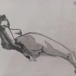 Recuerdo perfectamente la tarde en que hice este dibujo. Me encontraba en un viejo taller, rodeado de mis compañeros, todos enfocados en captar la quietud de la modelo que posaba para nosotros. La luz era tenue, y el ambiente estaba cargado de una calma inusual, mientras la ciudad seguía su vida fuera de esas paredes. Frente a nosotros, una mujer reclinada que parecía abandonar todo esfuerzo, como si la misma vida se hubiese detenido por unos minutos. Fue en ese instante que dejé que la tinta negra fluyera por el papel, trazando cada línea con una certeza extraña, casi como si no fuera yo quien estuviera dibujando, sino la tinta misma.