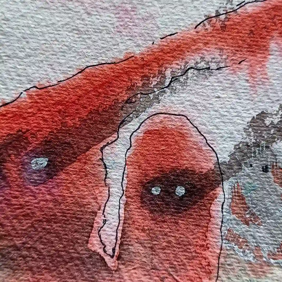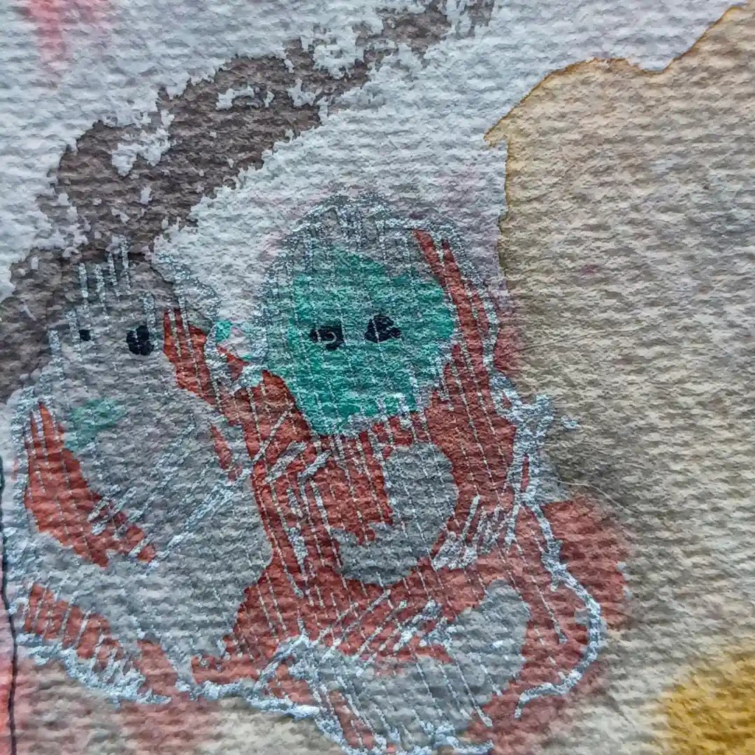 En la imagen aparecen dos figuras rojizas que caminan hacia el margen del papel. Una de ellas cubre a la otra con un manto que nace de su cabeza, simbolizando ese deber de proteger que sentía en mi pecho al enfrentarnos a una situación como esa. Era como si el pensamiento mismo se transformara en abrigo. Los dos personajes dejan atrás a dos figuras más, serenas, casi estoicas, que las miran marcharse. Eran mi familia. Mis amigos. Los que se quedaron.