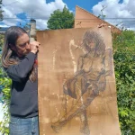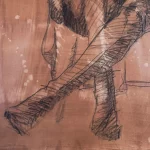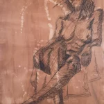 Cuando observo este dibujo artístico, me invade una sensación de orgullo y conexión profunda con la figura que representé. Este dibujo no es simplemente una práctica de academia de dibujo artístico; es una expresión personal, una ventana a la relación única que se forja entre el artista y su modelo. Recuerdo claramente la sesión en la que creé esta obra: la preparación del papel con nogalinas y esos salpicones de lejía para crear un ambiente envolvente y misterioso. Fue un proceso que me permitió no solo captar la forma humana, sino también infundirle una atmósfera especial que eleva la pieza más allá de un simple estudio.