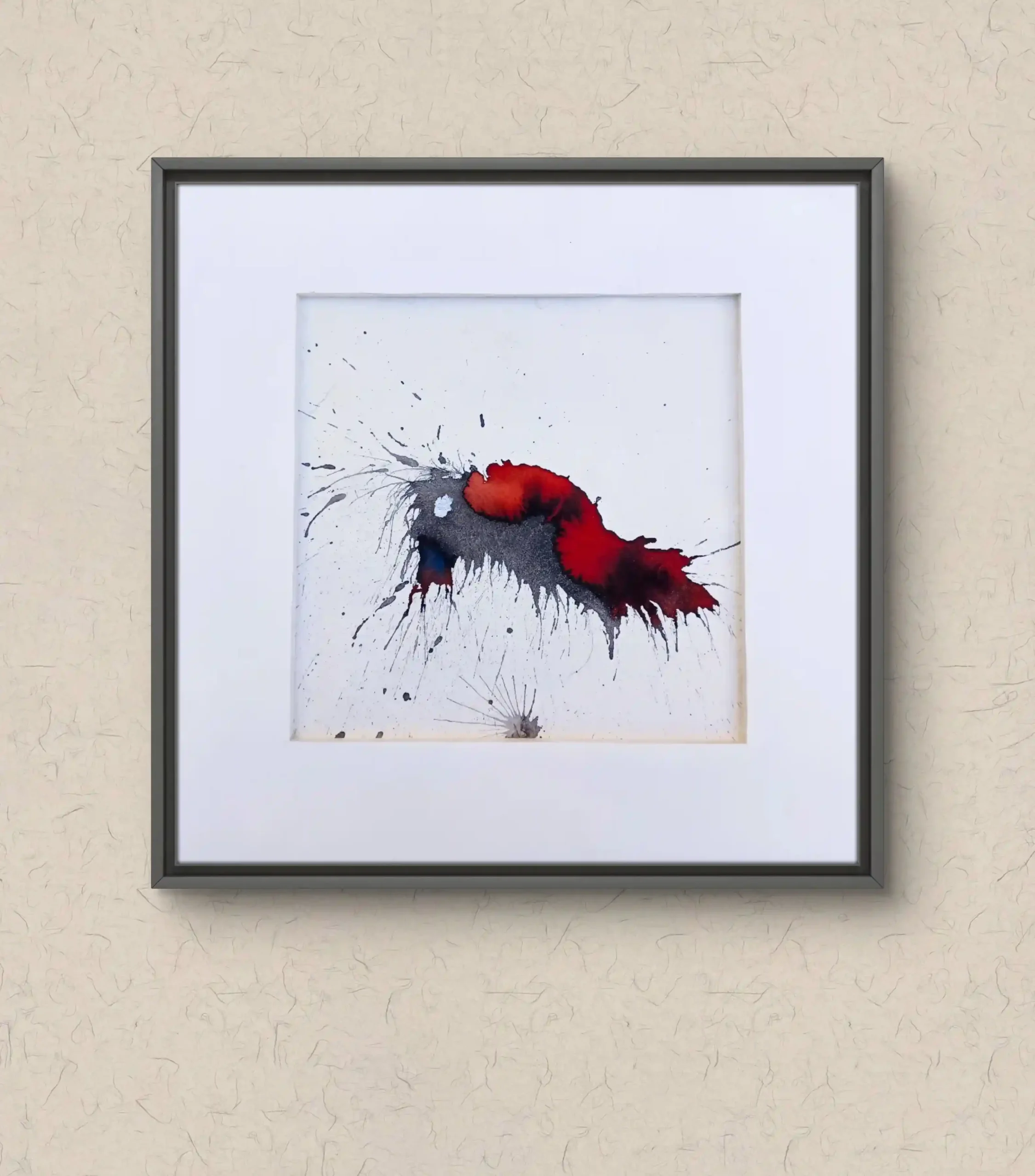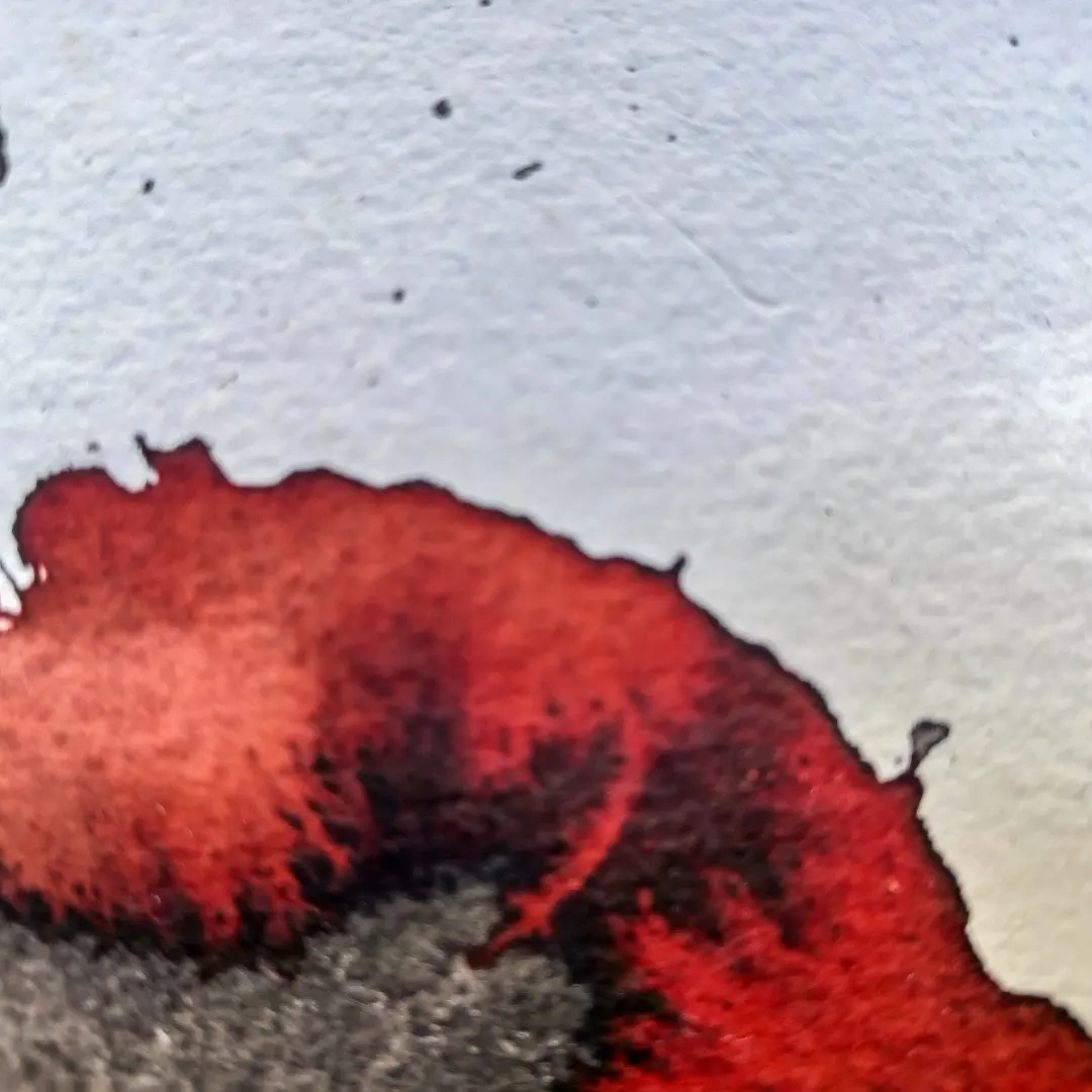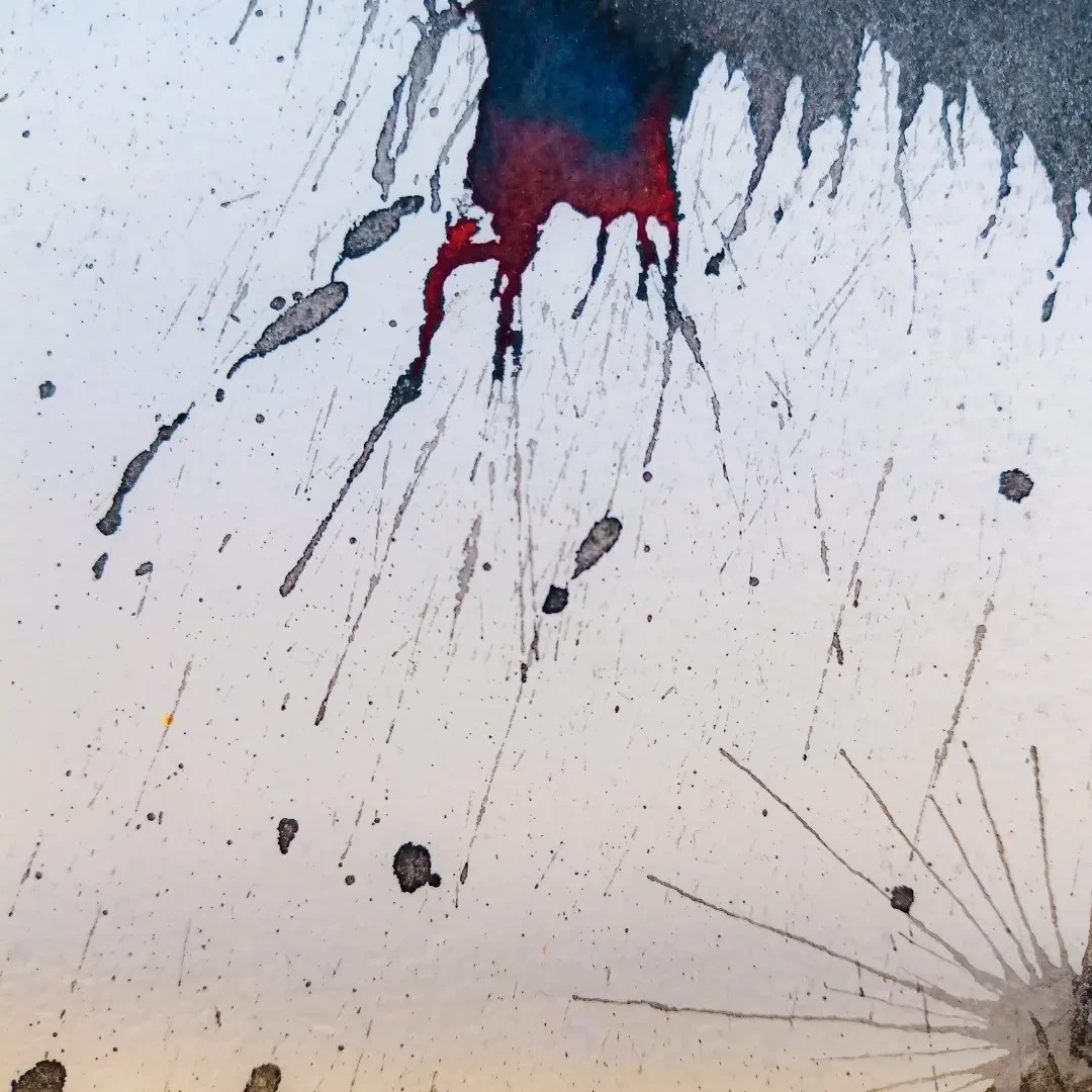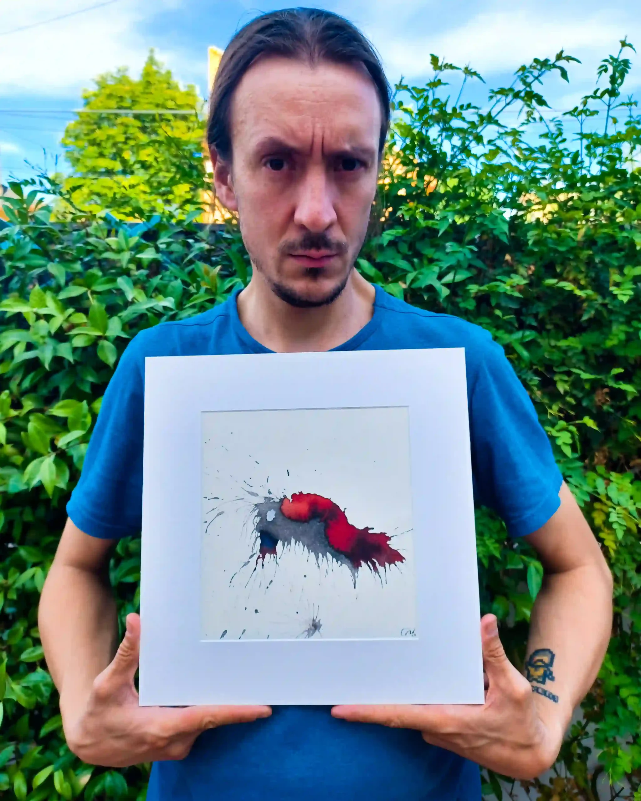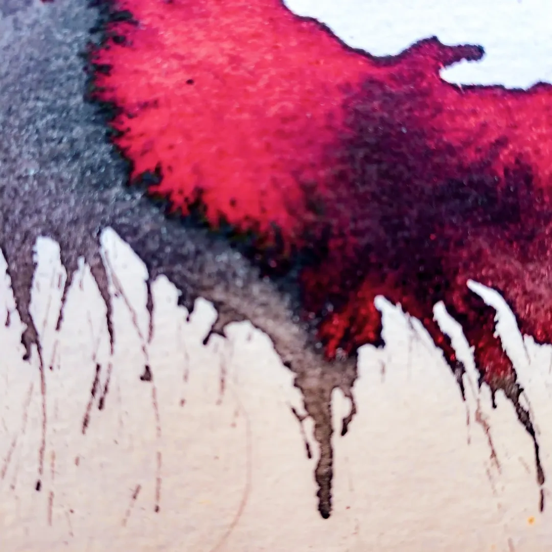 La técnica fue una mezcla de gestos automáticos y controlados: charcos de acuarela líquida en rojo y negro, presionados con la técnica de decalcomanía, y después soplados con un tubito para generar esos pelos, como si la figura se descompusiera en una nube de terror peludo. Esa joroba, ese ojo plateado que parece estallar y escupir desde dentro… no hubo diseño previo. Fue la mancha la que decidió.