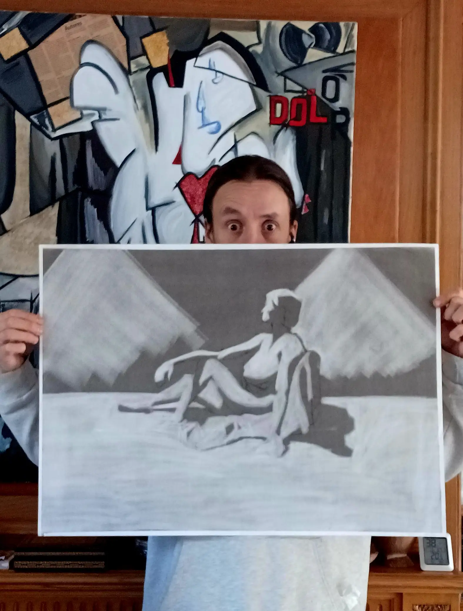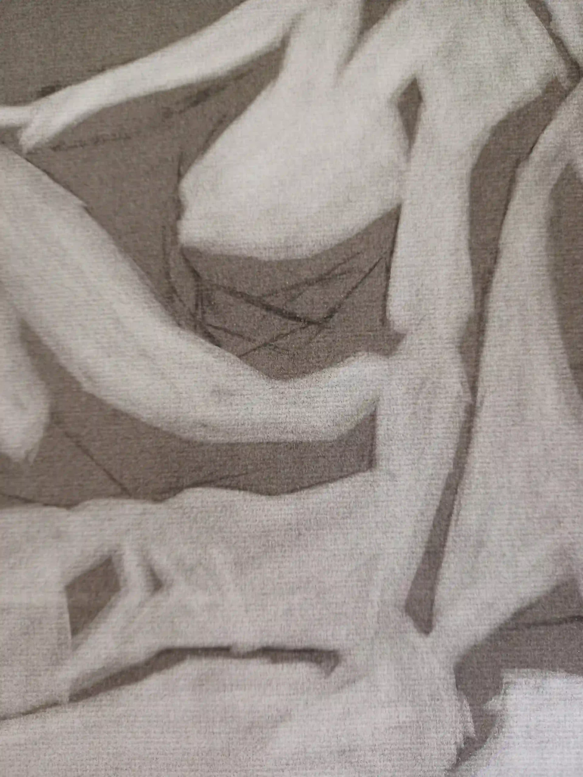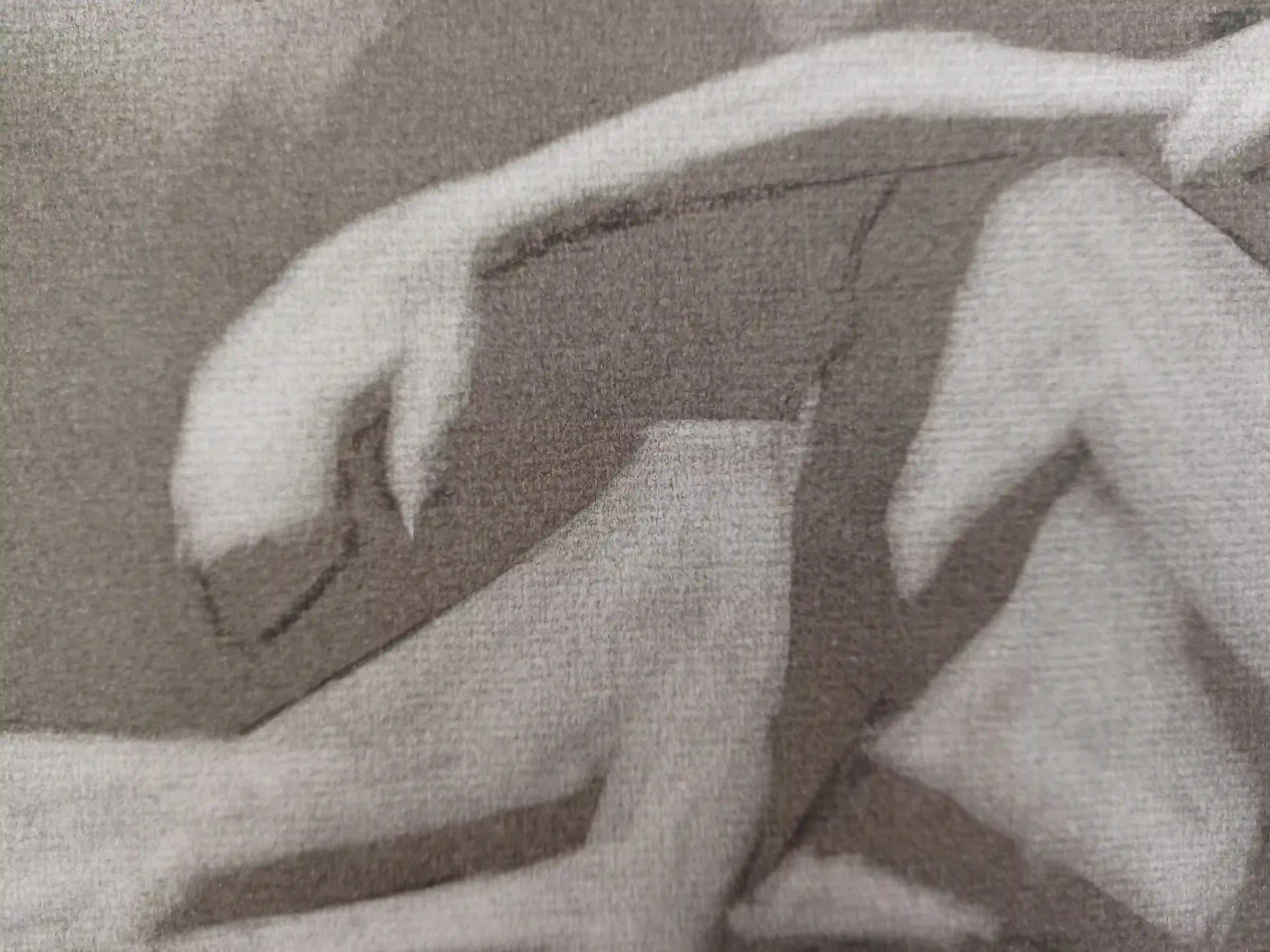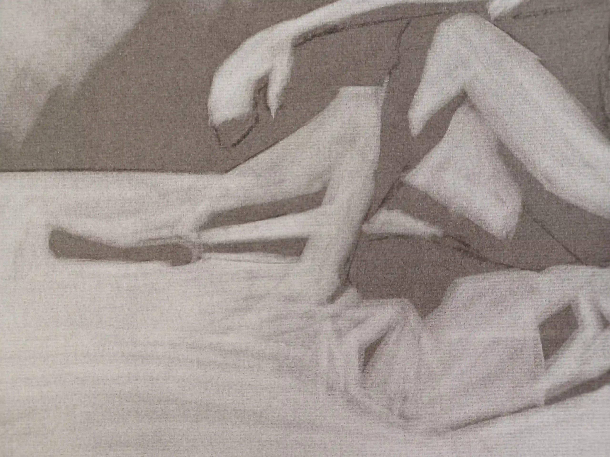 He decidido mantener algunas líneas de encaje para añadir calidez a la obra y guiar al espectador en la interpretación de la escena. La modelo, a quien cariñosamente llamaba «Venus steatopigia» por sus características físicas tan distintivas, era una persona fascinante y encantadora, lo que hizo que este proceso creativo fuera una experiencia especialmente gratificante. Su energía alegre y su cuerpo único hicieron que cada sesión de dibujo fuera memorable.