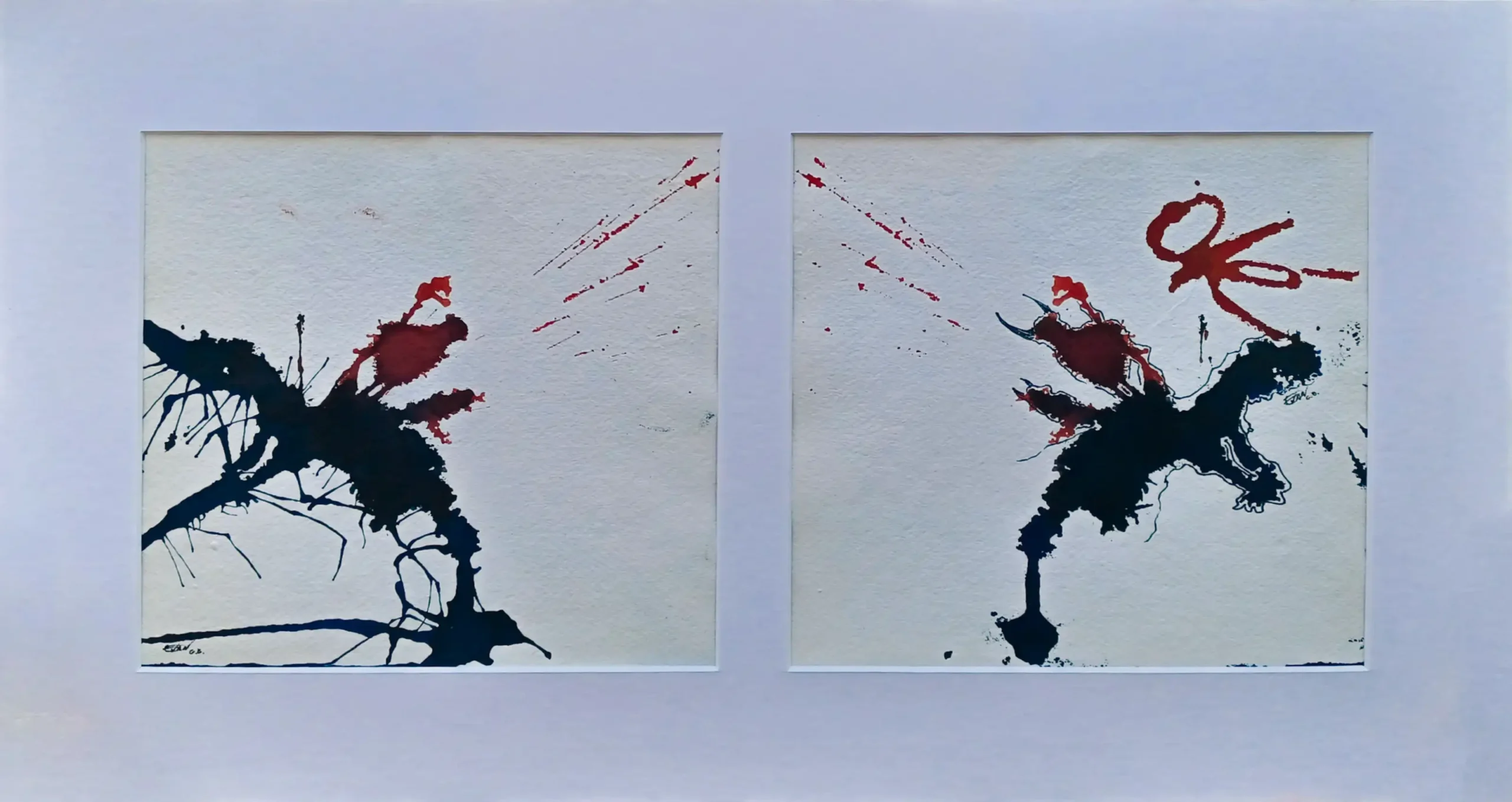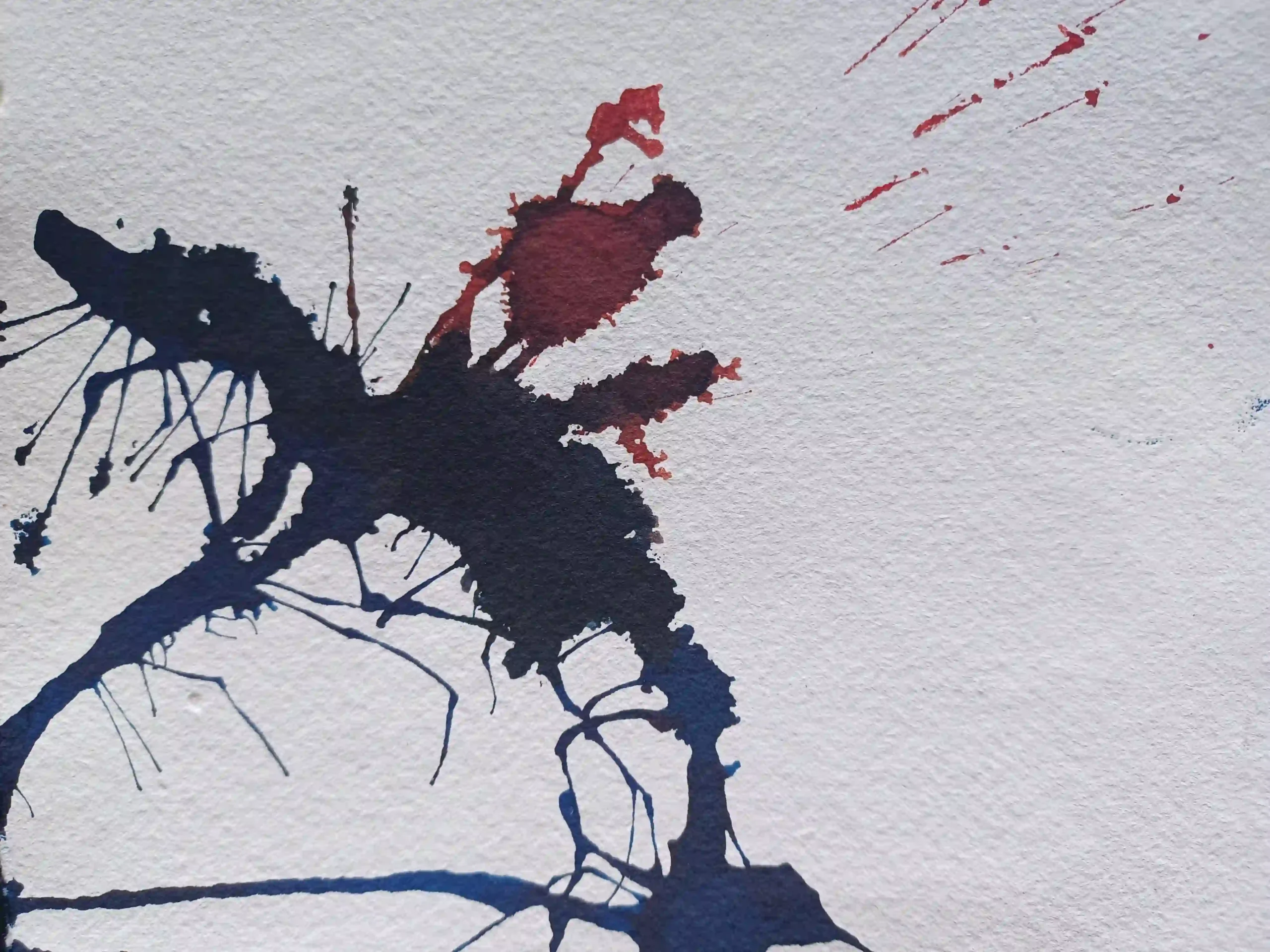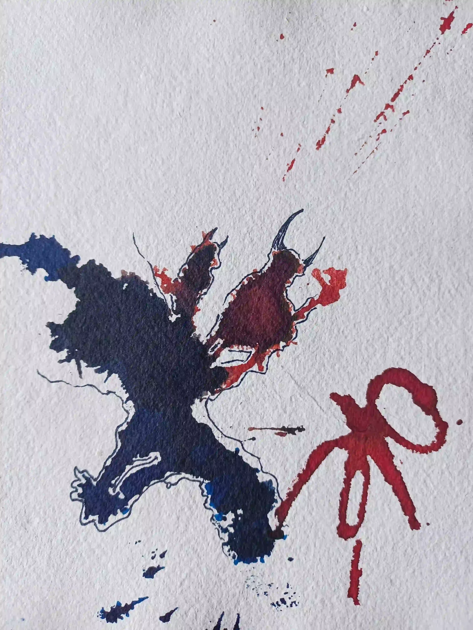 Recuerdo perfectamente el momento en que surgió. Estaba recogiendo los materiales, ya con la mancha aún húmeda, y por costumbre apoyé un papel encima. Cuando lo levanté, allí estaban: dos versiones del mismo animal. Una viva, otra a punto de quebrarse. Me impactó, lo confieso. Y me quedé absorto mirándola, tratando de escuchar su mensaje, de reconocernos en la imagen. Porque hay algo profundamente español en esa dualidad: la euforia y el desastre, el grito y la caída. El “Viva” y el silencio posterior.