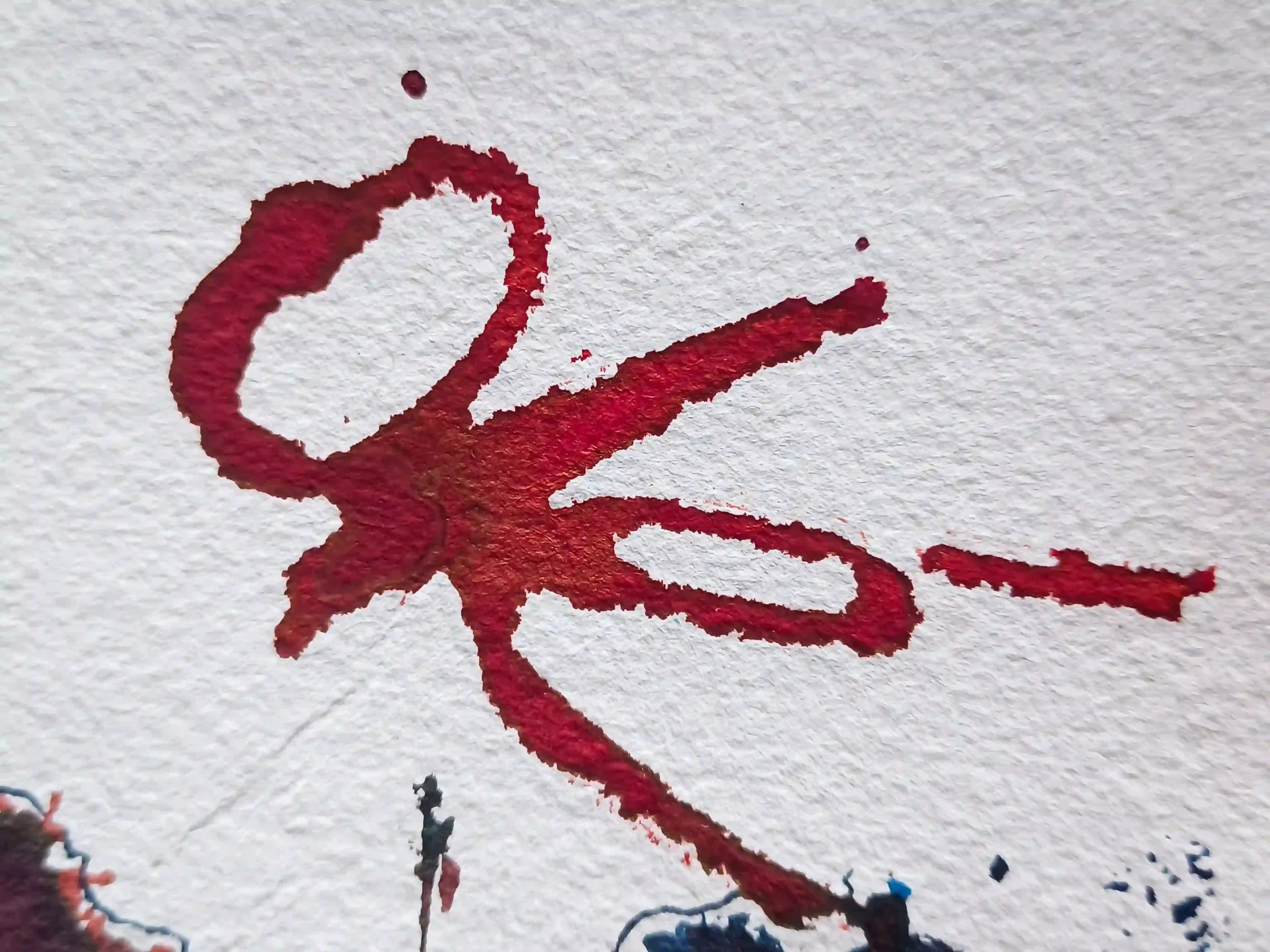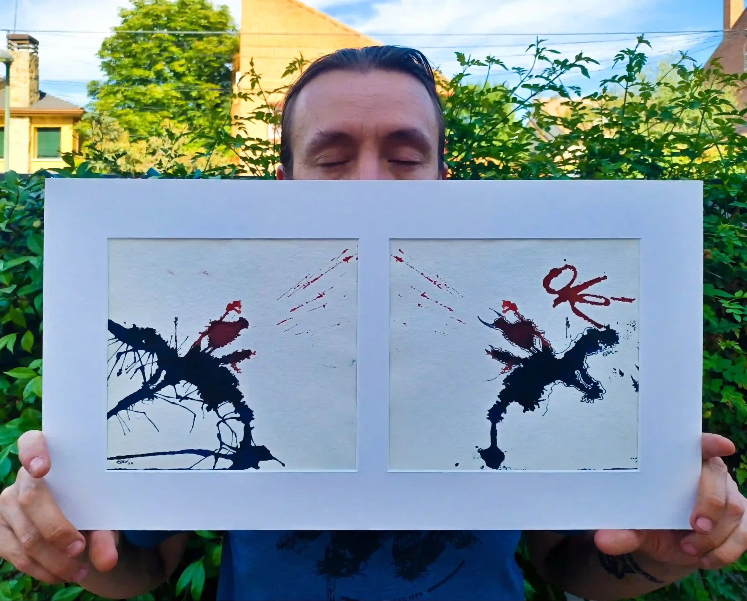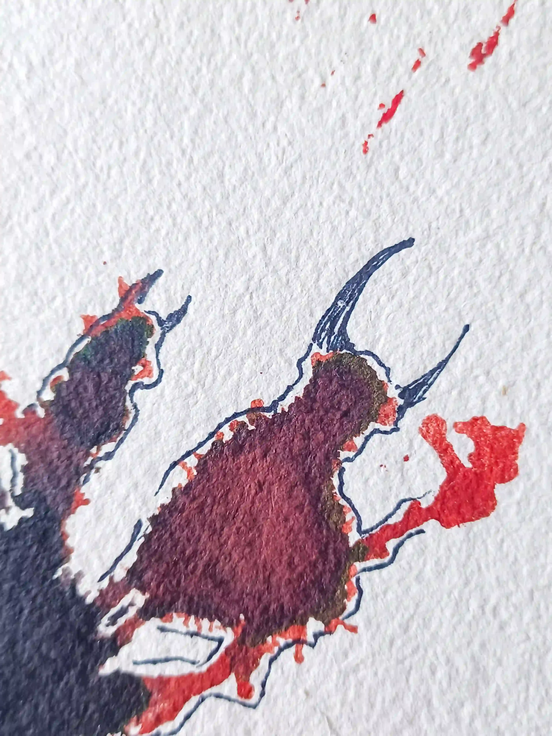 Recuerdo perfectamente el momento en que surgió. Estaba recogiendo los materiales, ya con la mancha aún húmeda, y por costumbre apoyé un papel encima. Cuando lo levanté, allí estaban: dos versiones del mismo animal. Una viva, otra a punto de quebrarse. Me impactó, lo confieso. Y me quedé absorto mirándola, tratando de escuchar su mensaje, de reconocernos en la imagen. Porque hay algo profundamente español en esa dualidad: la euforia y el desastre, el grito y la caída. El “Viva” y el silencio posterior.