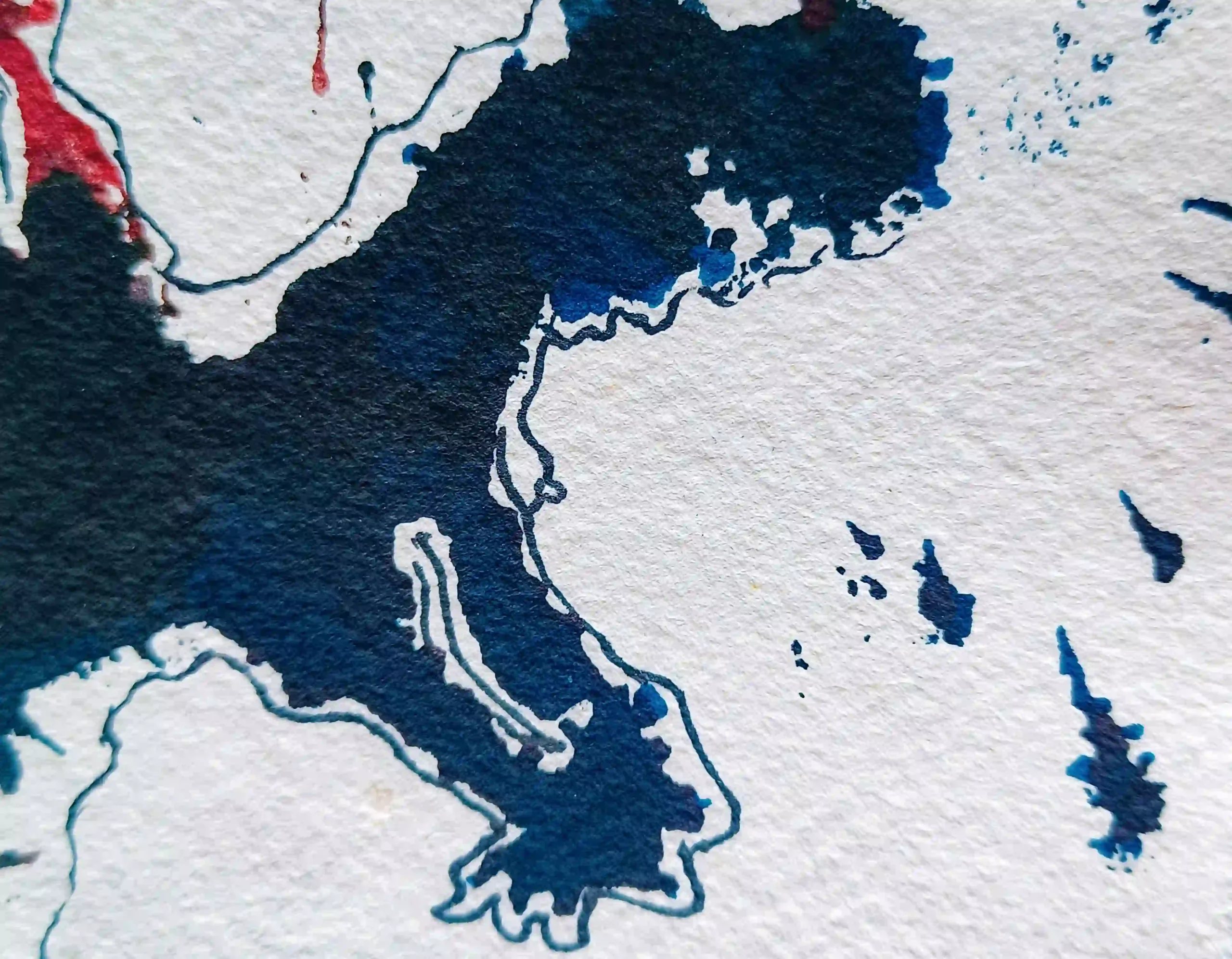 La técnica mezcla la decalcomanía con soplado de tinta en estado húmedo. Inicialmente, solo existía la imagen de la derecha, pero fue el azar —tan presente en este tipo de procesos— el que reunió ambas mitades. Al observarlas juntas, sembró la duda. Y no pude más que consultar a mi amigo y confidente Miguel, le expliqué mis dudas y al escuchar su opinión de repente todo encajó. Lo que iba a ser una imagen se convirtió en una doble narrativa: la del símbolo glorificado y la del símbolo corroído por dentro.